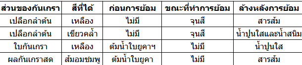 3.การย้อมเส้นฝ้ายด้วยสีจากผลกันเกราสด นำผลกันเกราสดที่สุกแดงจำนวน 2 กิโลกรัมมาบดให้แตก ขย้ำให้เนื้อผลแตกมากที่สุด ในน้ำ 5 ลิตร กรองแยกเอากากออก วัด pH ของน้ำสี นำน้ำสีไปต้มย้อมเส้นฝ้าย น้ำหนัก 70 กรัม/ ใจ จำนวน 2 ใจ