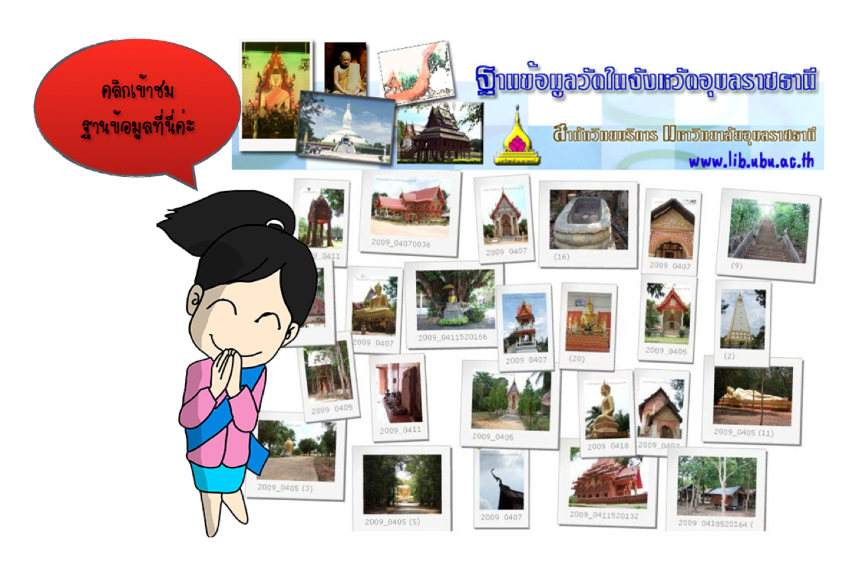 สำนักวิทยบริการ ได้จัดทำฐานข้อมูลวัดในจังหวัดอุบลราชธานีขึ้น โดยมีข้อมูลวัดทั้งหมด 1536 วัด แยกออกเป็นอำเภอต่าง ๆ ข้อมูลของแต่ละวัดประกอบด้วยประวัติการก่อตั้งวัดนั้น ๆ นอกจากนั้นแล้ว วัดที่เป็นวัดสำคัญของจังหวัดก็จะมีข้อมูลภาพถ่าย และวีดิทัศน์ด้วย