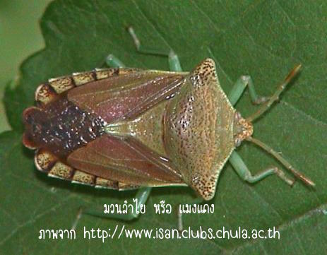 4.มวนลำไย หรือแมงแคง จะสร้างสารที่มีฤทธิ์เป็นกรดสูง หากโดนสารพิษนั้นจะทำให้เกิดแผลพุพอง แสบร้อน